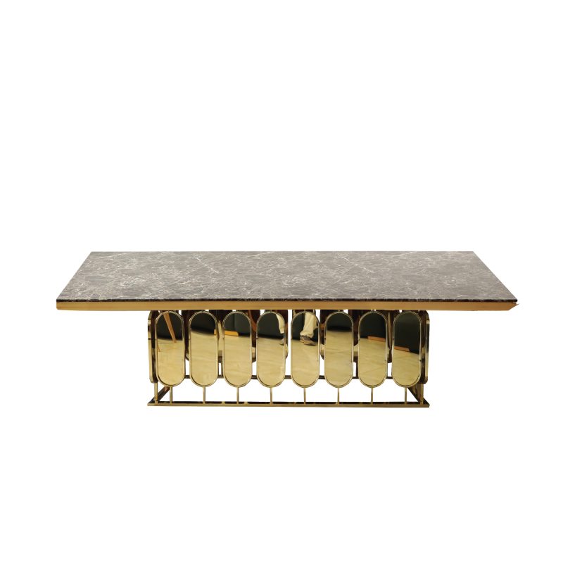 ໂຕະຮັບປະທານອາຫານ ໜ້າຫີນອ່ອນຊົງຫຼ່ຽມສັງເຄາະປິດຜິວດ້ວຍການເຄືອບເງົາເພີ່ມຄວາມໂດດເດັ່ນຫຼູຫຼາເບິ່ງມີພູມຖານທົນທານຕໍ່ຄວາມຮ້ອນໄດ້ດີ ແລະ ອາຍຸການໃຊ້ງານຍາວນານ, ຮູບຊົງຂອງຂາຖືກອອກແບບໃຫ້ມີຄວາມເປັນເອກະລັກເບິ່ງທັນສະໄໝ ເຂົ້າກັບບ້ານໄດ້ຫຼາກຫຼາຍຮູບຊົງ