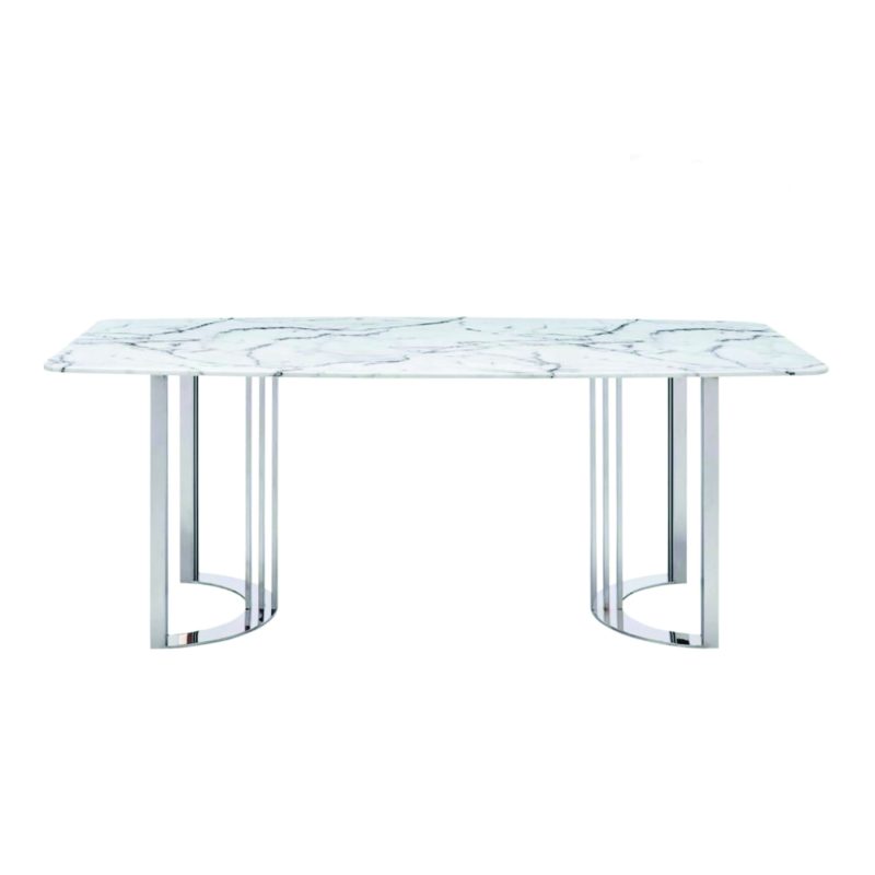 ໂຕະຮັບປະທານອາຫານ ໜ້າຫີນອ່ອນຊົງຫຼ່ຽມປາຍມົນເຂົ້າກັນກັບຖານໂລຫະຄຸນນະພາບດີ ມີຄວາມໂດດເັ່ນຫຼູຫຼາເບິ່ງມີພູມຖານ