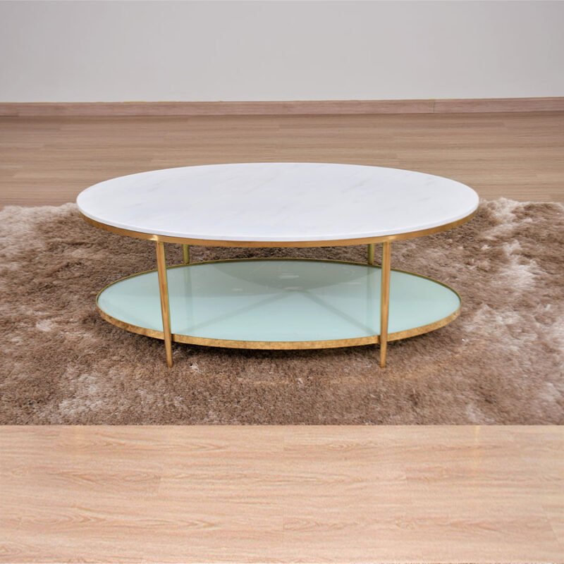 ໂຕະກາເຟ ໂຄງສ້າງເຮັດເຫຼັກຊຸບສີທອງ, ໜ້າໂຕະເປັນຫີນອ່ອນທຽມ ສອງເຊັ້ນ ສີຂາວ
